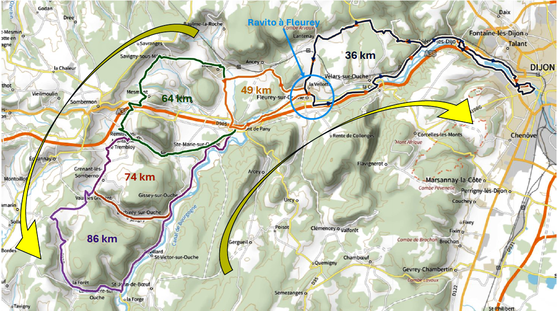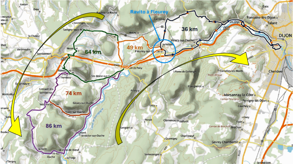 Pour tous les parcours, aller commun jusqu’à Fleurey (ravito), retour commun depuis Fleurey.